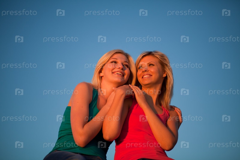 Две молодые женщины сидят на закате, прижавшись друг к другу