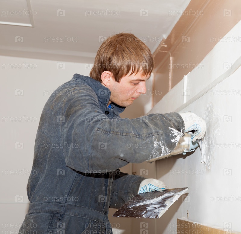 Штукатур шпаклюет стену