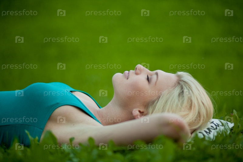 Молодая женщина с закрытыми глазами лежит на траве