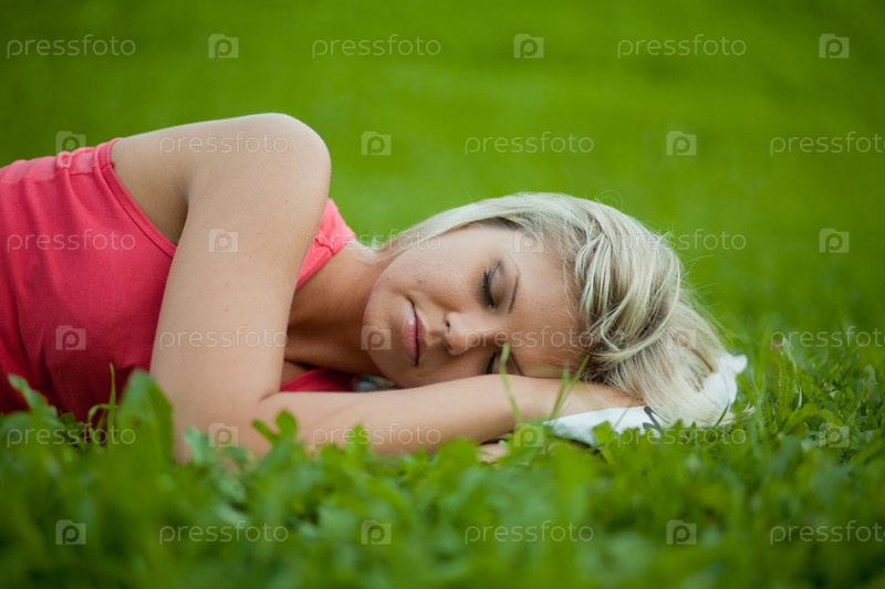 Молодая женщина с закрытыми глазами лежит на траве