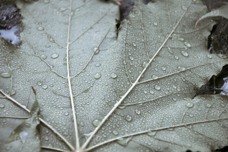 Кленовый лист, покрытый капельками воды. Крупный план