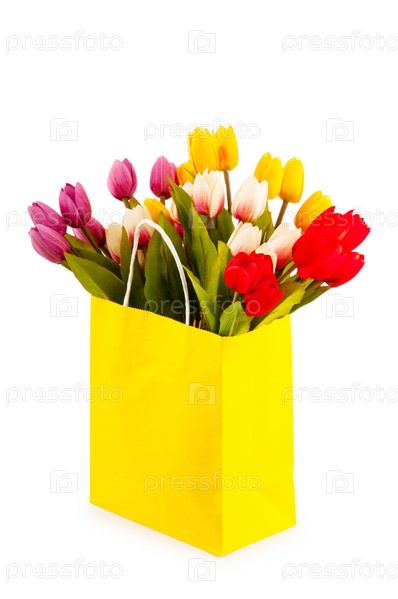 Тюльпаны в желтом пакете на белом фоне