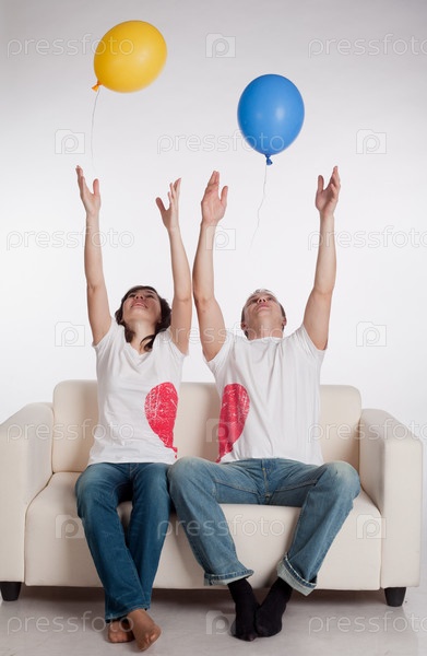 Радостные женщина и мужчина с воздушными шарами сидят на диване