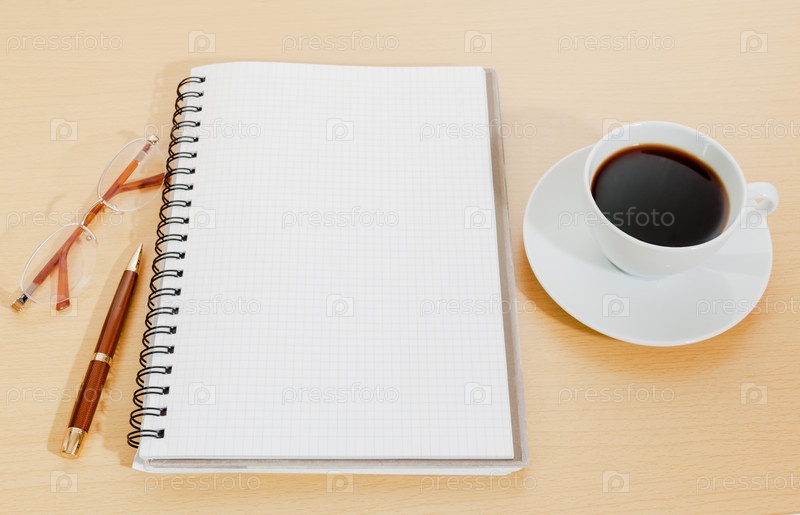 Чашка кофе, очки и блокнот