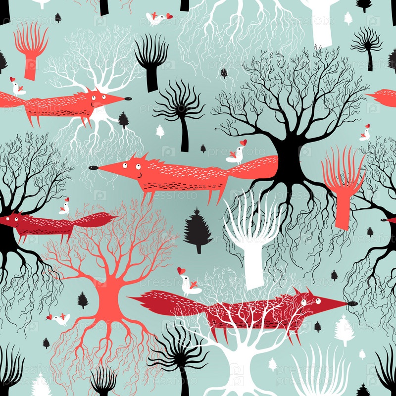 Деревья и лисы на голубом фоне