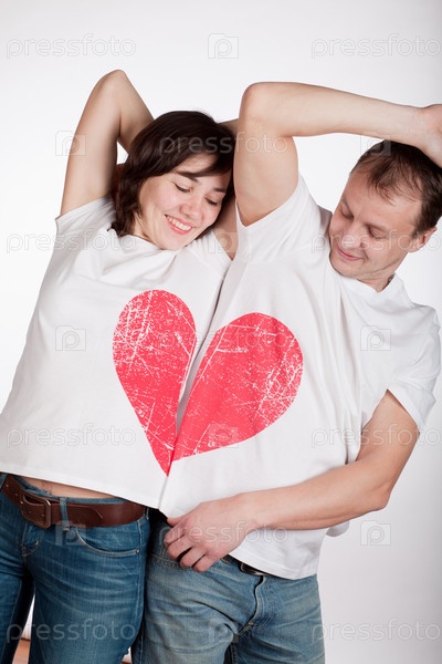 Женщина и мужчина в футболках с сердцем позируют на светлом фоне
