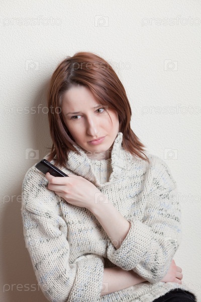 Задумчивая молодая женщина с мобильным телефоном на светлом фоне
