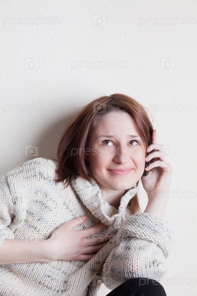 Счастливая молодая женщина разговаривает по мобильному телефону на светлом фоне
