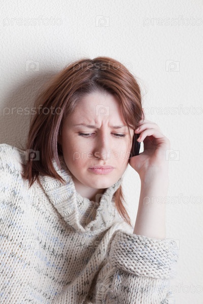 Расстроенная молодая женщина разговаривает по мобильному телефону на светлом фоне