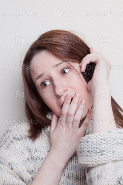 Шокированная молодая женщина разговаривает по мобильному телефону на светлом фоне