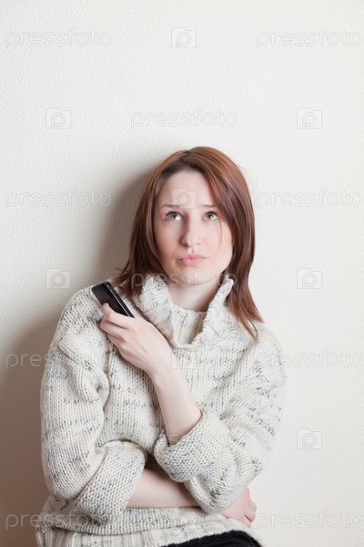 Задумавшаяся молодая женщина с мобильным телефоном на светлом фоне