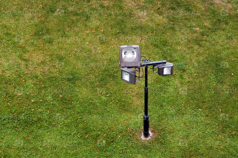 Мощный фонарь освещения на фоне зеленой травы
