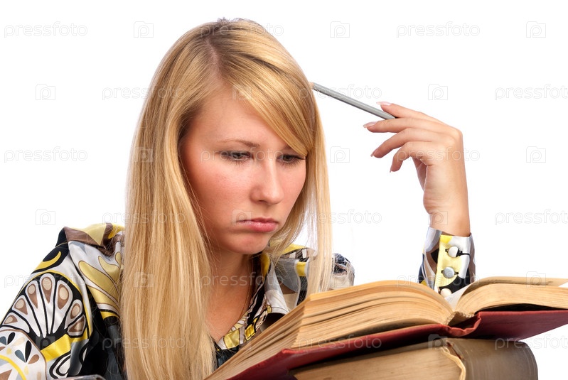 Молодая серьёзная студентка, изолированная на белом фоне
