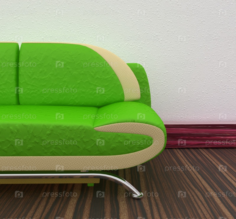 Половина зелено-бежевого дивана с металлической опорой. Диван стоит на полу, выложенном коричневым ламинатом с широким бордовым плинтусом