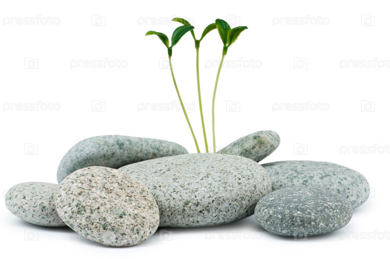 Галька и саженцы, изолированные на белом фоне