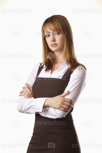 Молодая девушка в строгом платье на белом фоне