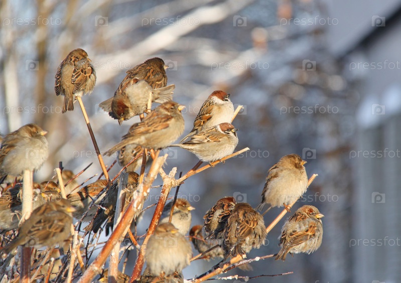 Воробьи на ветке дерева зимой