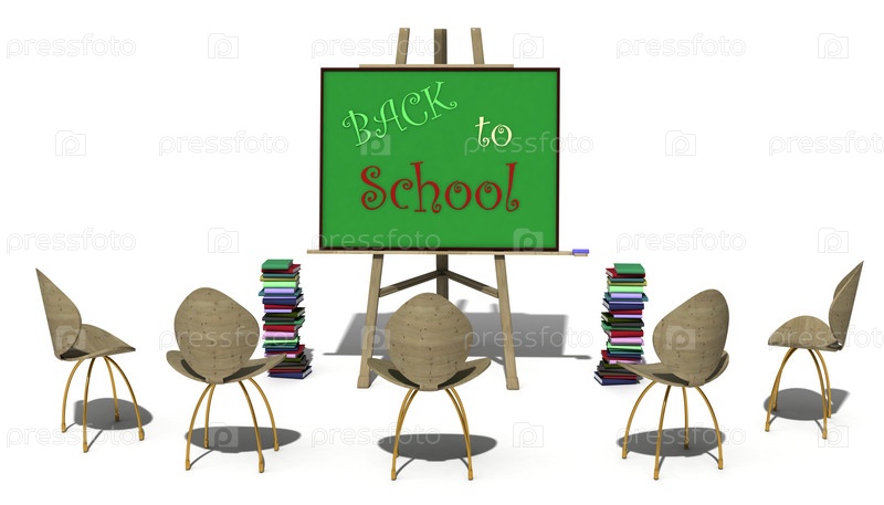 Стулья и стопки книг у школьной доски, белый фон