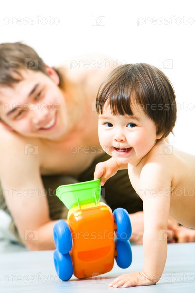 Вертикальное изображение маленького ребенка, держащего игрушку, в то время как ее отец смотрит на нее сзади