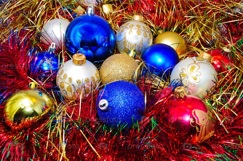 Разноцветные елочные украшения и мишура