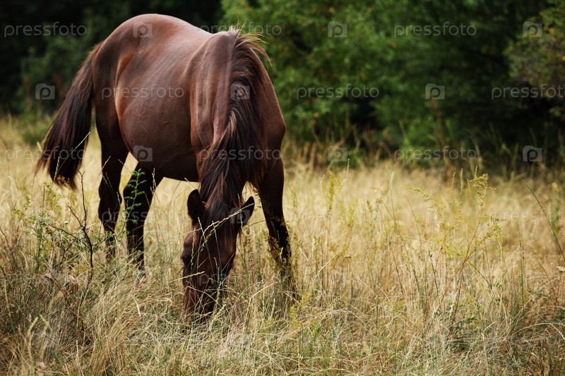 Лошадь пасется на лугу на фоне зеленых деревьев