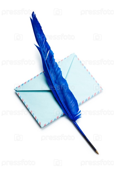 Конверт и шариковая ручка в виде синего пера на белом фоне