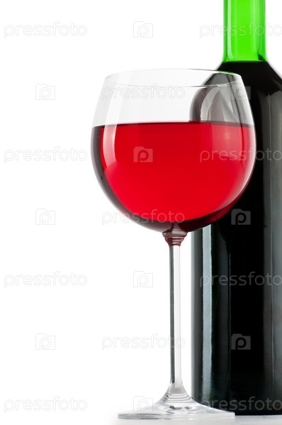 Бутылка красного вина и бокал на белом фоне