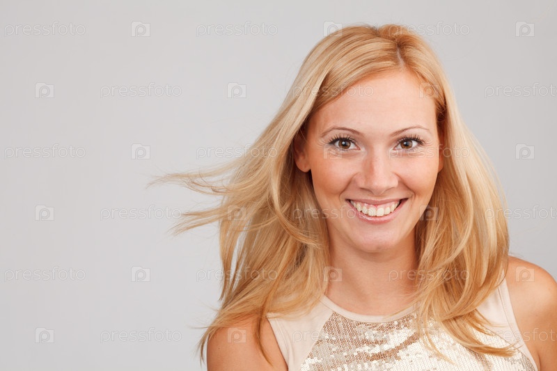Портрет красивой девушки с великолепной улыбкой на сером фоне