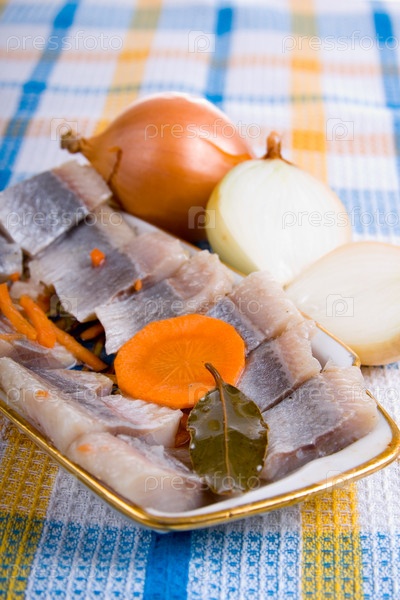 Соленая сельдь в масле с луком на тарелке