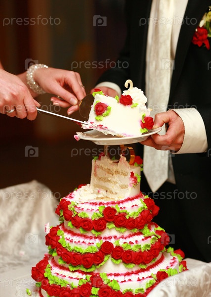Руки разрезают красивый свадебный торт