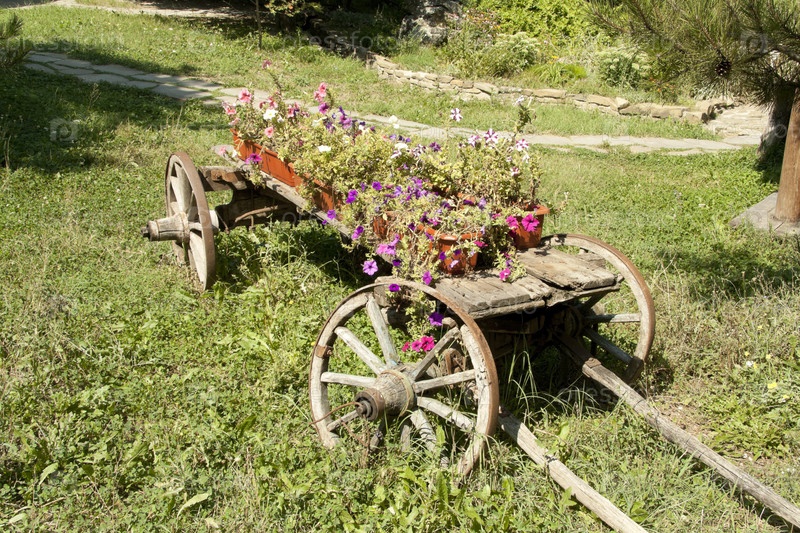 Старая тележка, на которой растут цветы