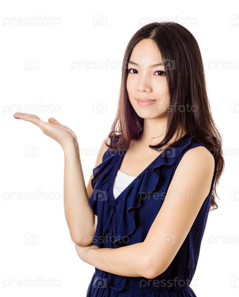Азиатская девушка в синей блузке на белом фоне с рукой как подставка