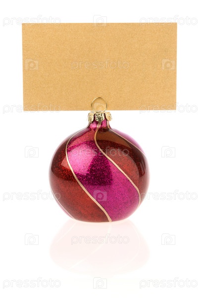 Рождественский шар с пустой карточкой для вашего текста, изолированный на белом