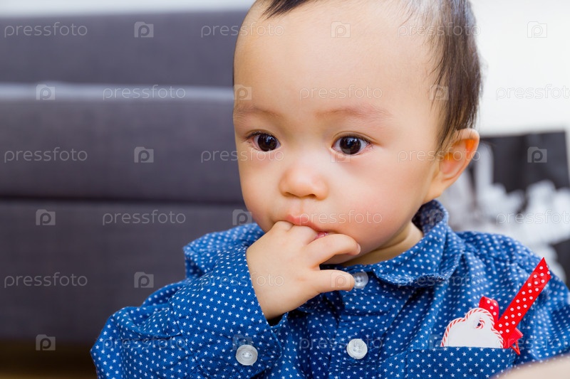 Азиатский ребенок в синей рубашке с пальцами во рту на фоне дивана
