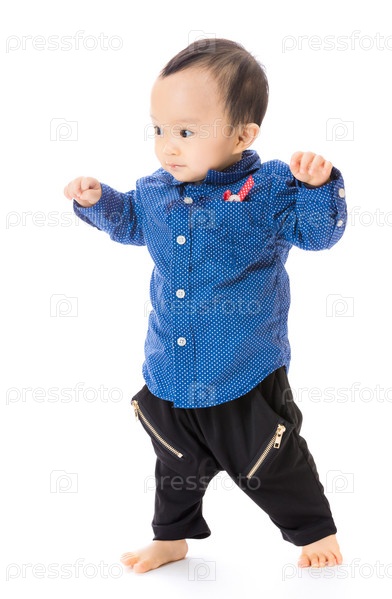 Азиатский ребенок в синей рубашке стоит на ногах, подняв ручки вверх, и смотрит в бок на белом фоне