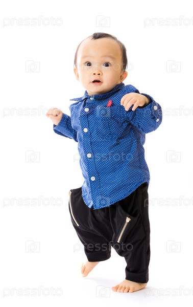 Азиатский ребенок в синей рубашке переминается с ноги на ногу, на белом фоне