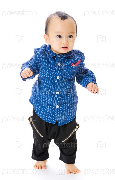 Азиатский ребенок в синей рубашке стоит на ногах, на белом фоне