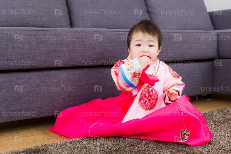Азиатский ребенок в национальном костюме сидит на ковре у дивана и держит во рту пояс