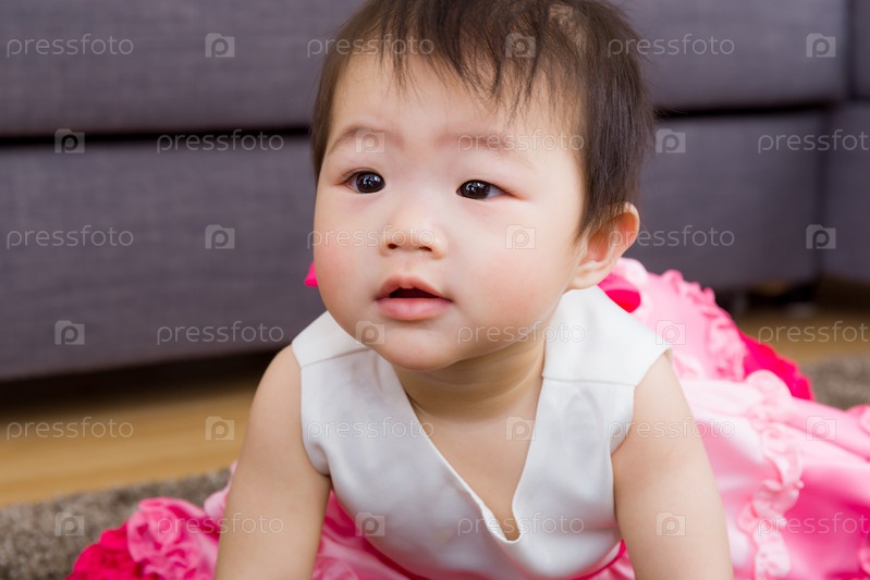Азиатская девочка сидит на ковре у дивана в пышной розовой юбке, белой кофточке крупным планом