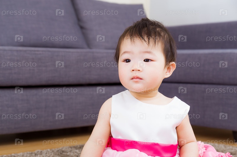 Азиатская девочка сидит на ковре у дивана в белой кофточке крупным планом, грустная