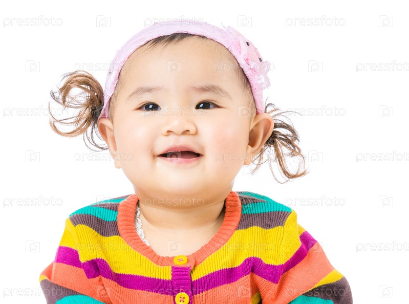 Азиатская девочка с хвостиками в полосатой кофточке улыбается на белом фоне