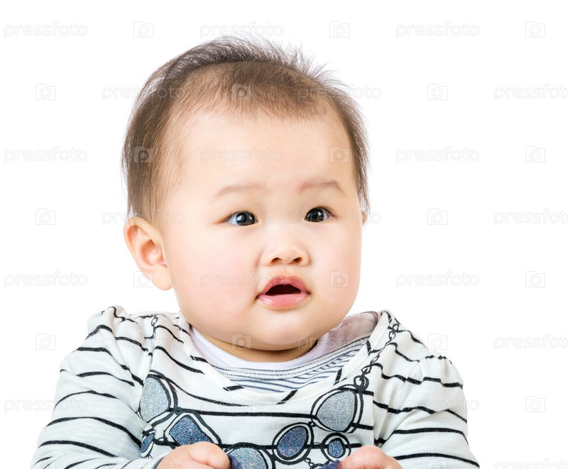 Азиатская девочка в полосатой кофточке с удивленным лицом на белом фоне крупным планом