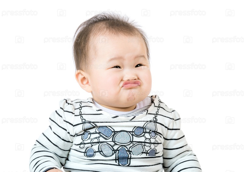 Азиатская девочка в полосатой кофточке с грустным лицом на белом фоне крупным планом