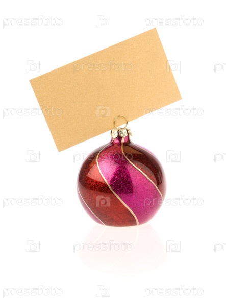 Рождественский шар с пустой карточкой для вашего текста, изолированный на белом