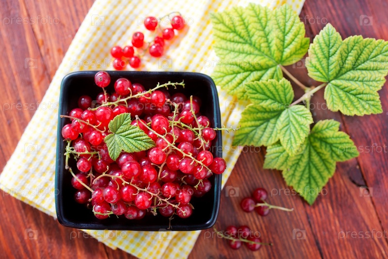 Ягоды и листья красной смородины на столе