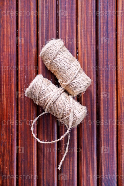 Два мотка грубой бечевки на фоне деревянной стены