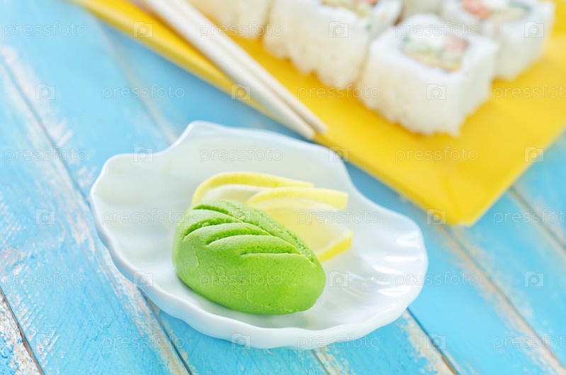 Роллы, васаби и лимон на столе