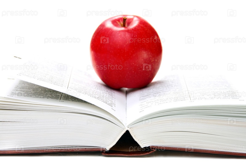 Красное яблоко лежит на раскрытой книге на белом изолированном фоне