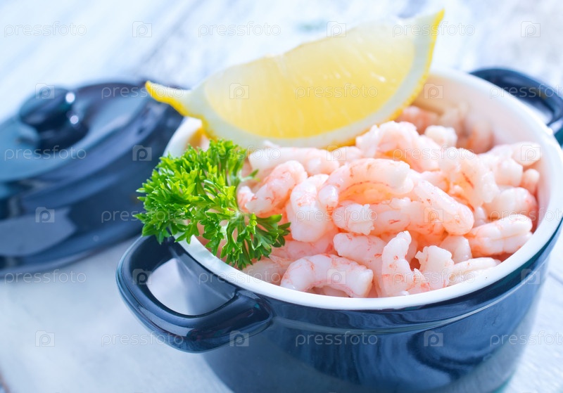 Сваренные креветки с ломтиком лимона в синей кастрюле