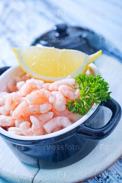 Сваренные креветки с ломтиком лимона в синей кастрюле